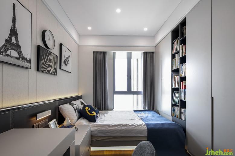 趣味性是小孩房必不可少的元素,同時對于世界的探索,也必定不能止于一面,因此,在有效利用空間的基礎上,將墻面直接設計成書柜形式,隱喻著內斂中蓄勢待發(fā)的可能性。