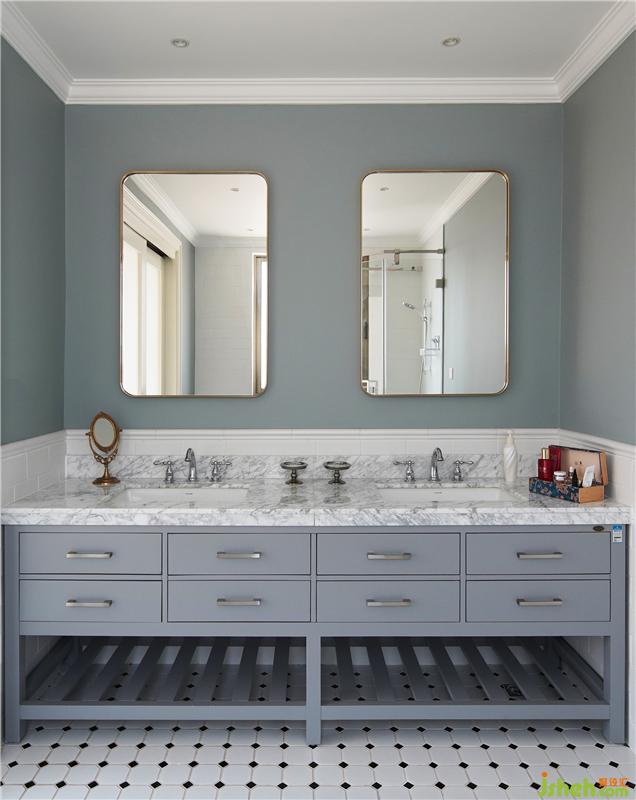 主衛(wèi)則是另一番光影,綠色交織著白色,透過(guò)玻璃、鏡面、光面瓷磚,顯得格外優(yōu)雅靈動(dòng),仿佛復(fù)古油畫般的空間質(zhì)感,使身心得以放松、心靈得到治愈.