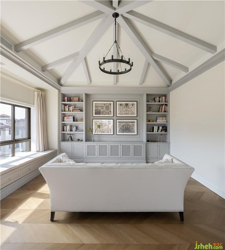 屋頂以藍(lán)色、白色、木色構(gòu)成,雪花狀的天花板設(shè)計(jì)也十分獨(dú)特,意象從物質(zhì)過(guò)渡到精神追求.光從拱形窗落下,自由流動(dòng)其中.