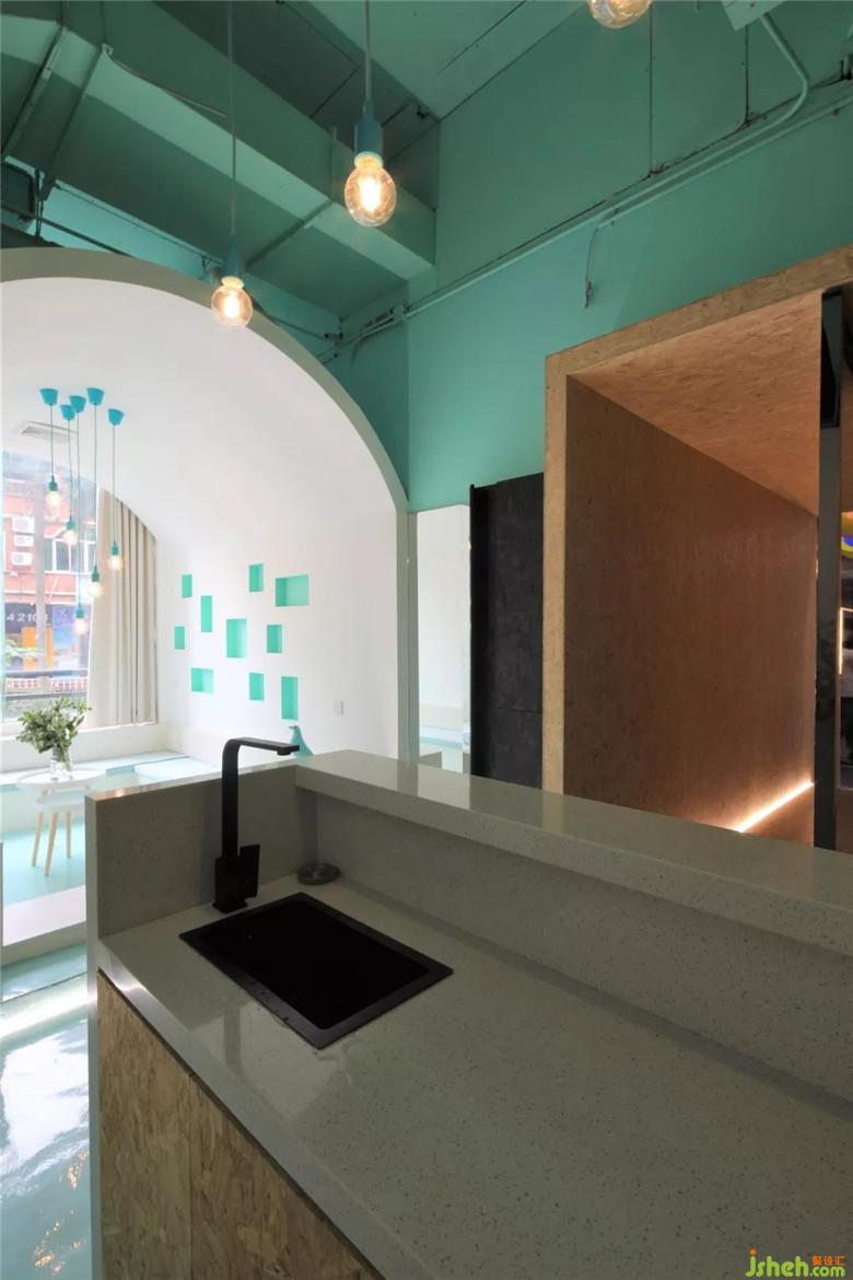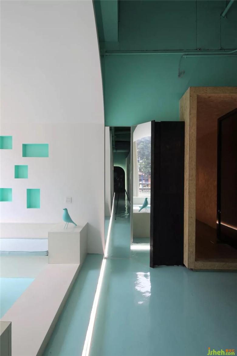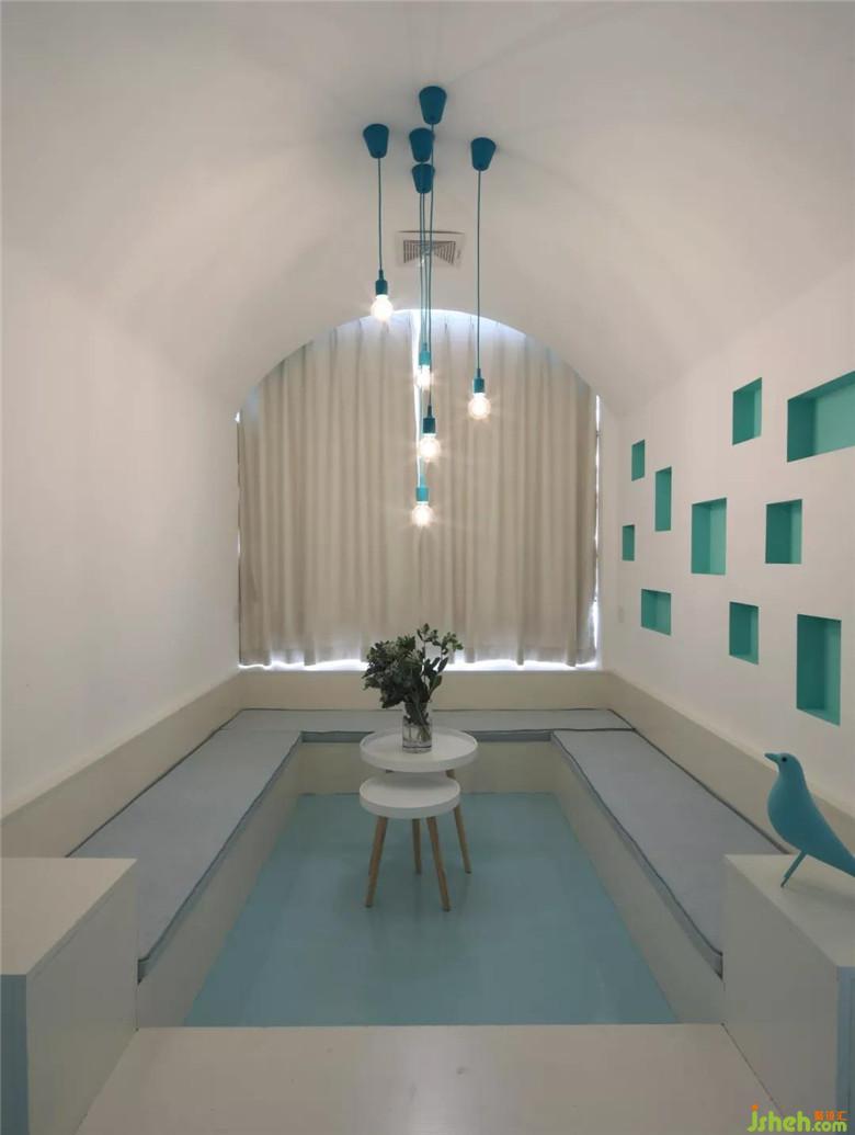 在這一片海洋或者天空的藍(lán)色長方形盒子,放進(jìn)兩個白色建筑。