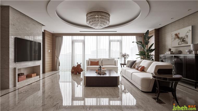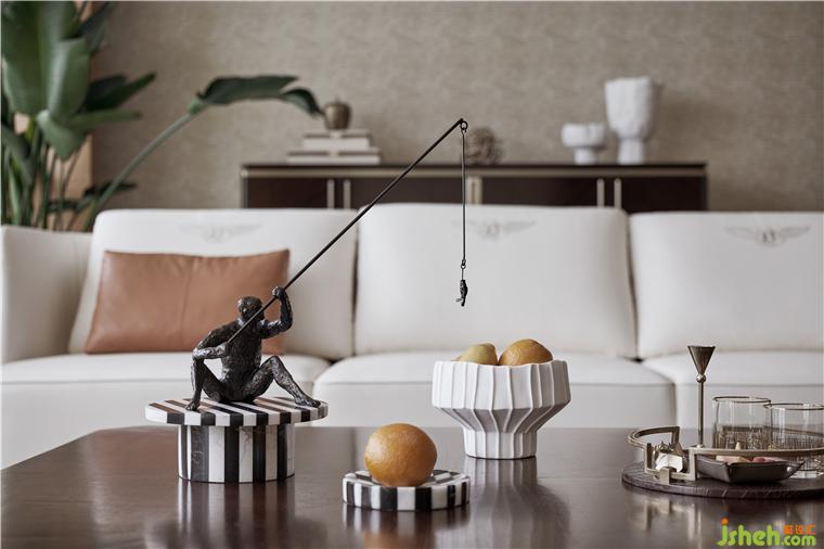 客廳背景以極具質(zhì)感的紋理大理石為主,配合優(yōu)雅的墻面色系,白色沙發(fā)皮質(zhì)細(xì)膩柔軟,又恰到好處的平衡空間色彩,剛?cè)岵?jì),加上不經(jīng)意擺放的各類擺件,悄然流露出居住者的藝術(shù)品位。