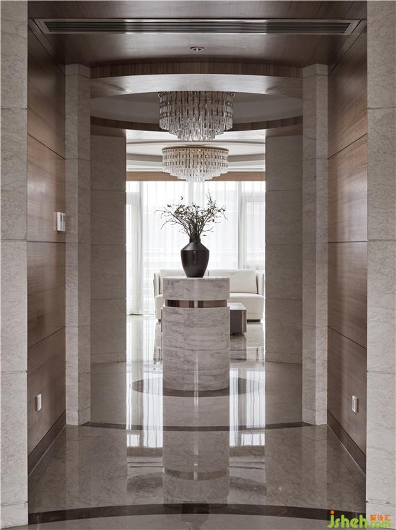 入口呈現(xiàn)出一種純粹奢華的形象。大理石圓柱和過道設(shè)計(jì)和諧對(duì)稱,古典優(yōu)雅,迎接著主人的歸來。