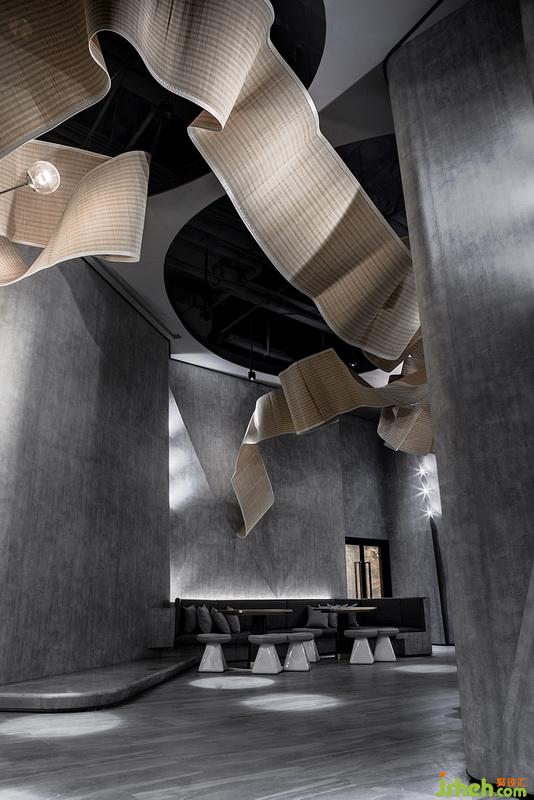 無論是舞龍中人為靈動的線條,還是山水所呈現(xiàn)出的自然紋理,都具有一種流動之美。室內(nèi)設(shè)計師將其運(yùn)用于天花構(gòu)造上,利用竹片打造流水紋理之狀,形態(tài)婉轉(zhuǎn)流動,有著靜極思動之勢。宛如中國的草書,狂亂中帶有優(yōu)美,這突破常規(guī)的構(gòu)造,不僅為娛樂場所帶來自然間流動韻律,深化空間的高級質(zhì)感,也讓視線收獲難以預(yù)料的驚喜。