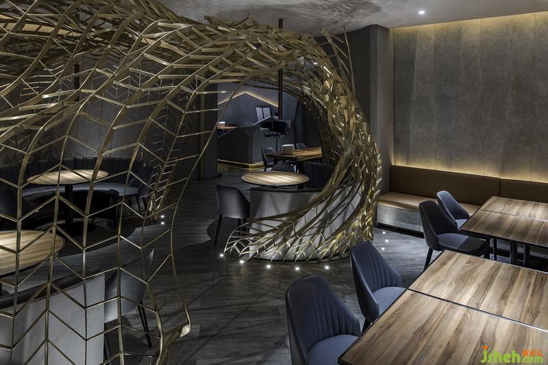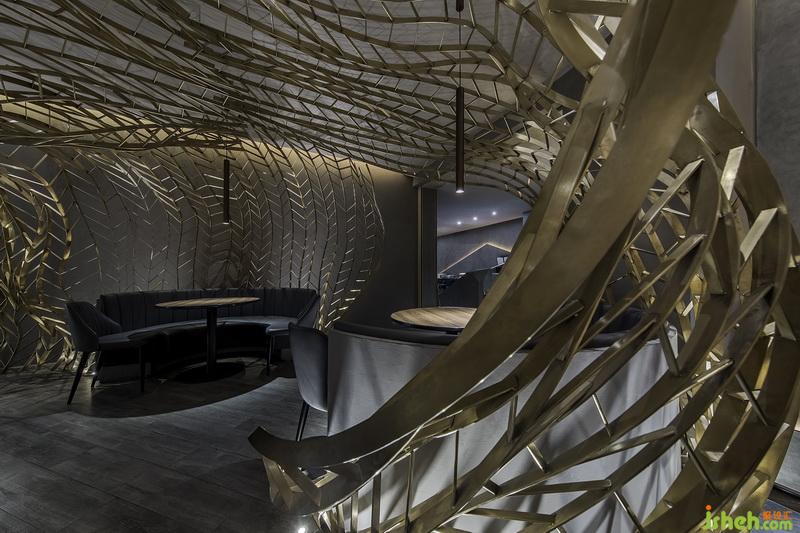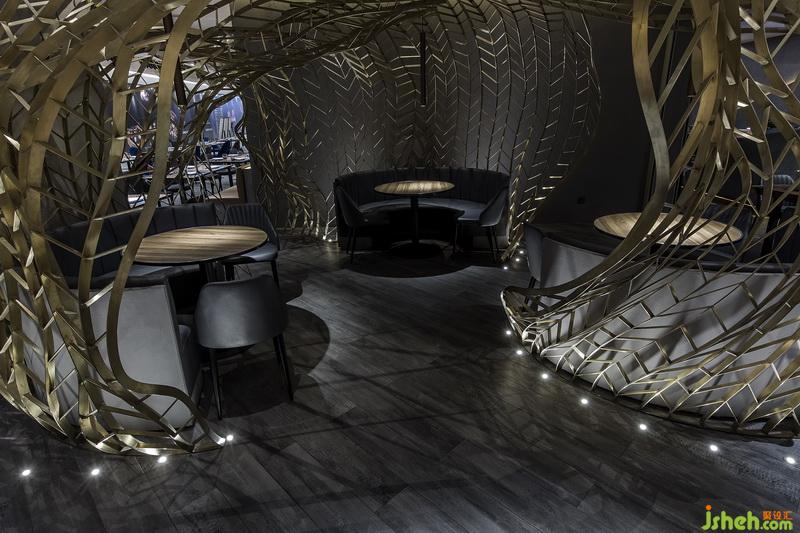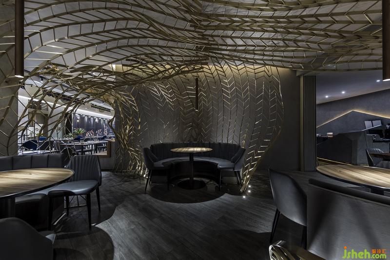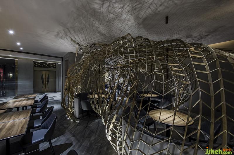 銹鋼之間縱橫交錯,仿若自地無限生長的樹枝,透露出蓬勃的生命力。燈光透過網(wǎng)狀裝置縫隙,投下了相互交錯的光影,光影搖曳之間,宛如樹影斑駁,風吹云動。