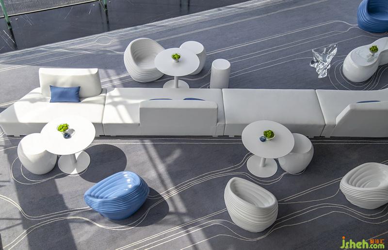 各個(gè)空間相互串通,人于空間內(nèi)游走,頗有移步異景之趣。洽談區(qū)呈條帶狀,地毯紋路如盈盈流水,不規(guī)則座椅作溪石,地毯曲線宛如“水”遇“溪石”所呈的蜿蜒曲折之狀,于空間中增添趣味。