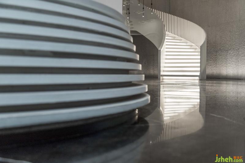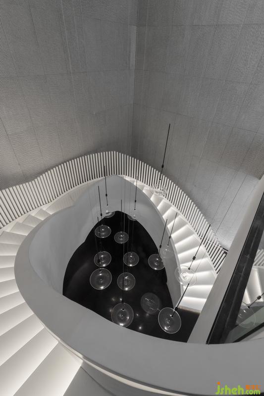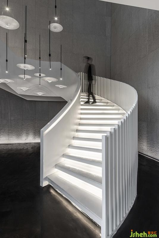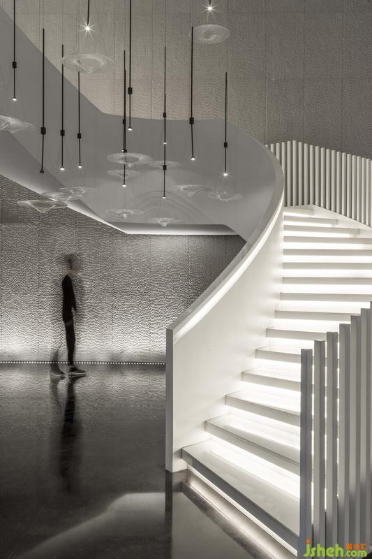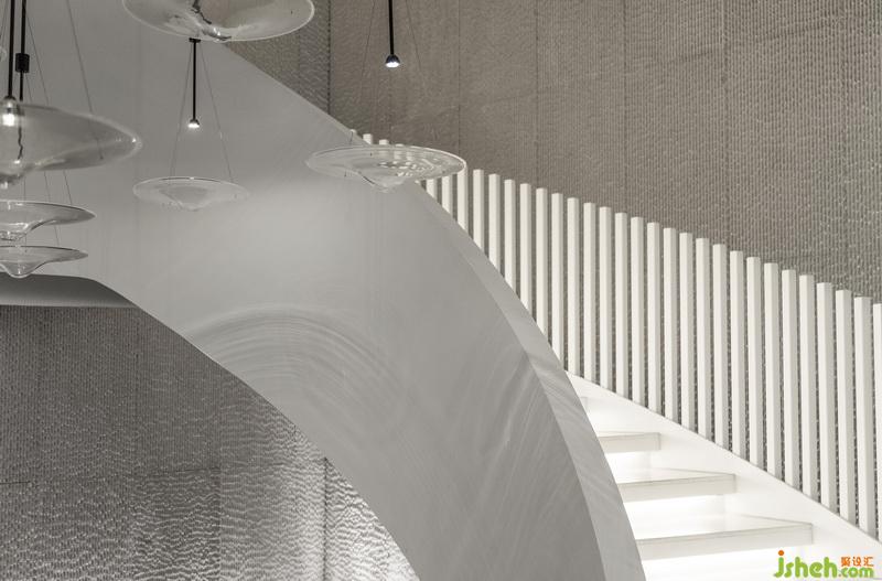 全案采用現(xiàn)代極簡手法繪制空間,以純凈白為主調(diào),不作過多繁雜裝飾,偶有幾抹跳動的藍點綴空間,以此突出自然人文的主題。設計師故意模糊了室內(nèi)與自然的界限,讓人即使身處室內(nèi),視野與心境卻越過空間的限制,與自然展開對話。