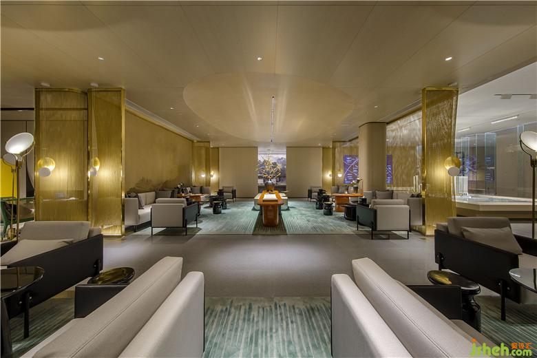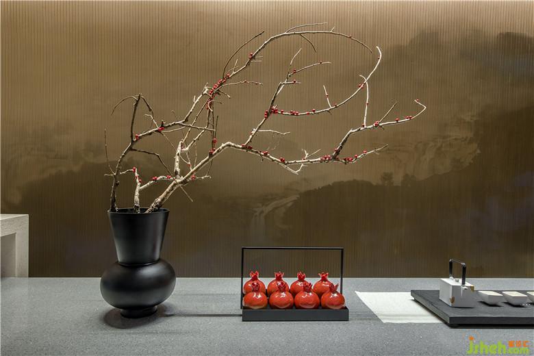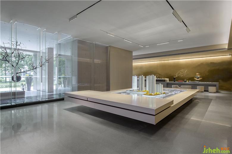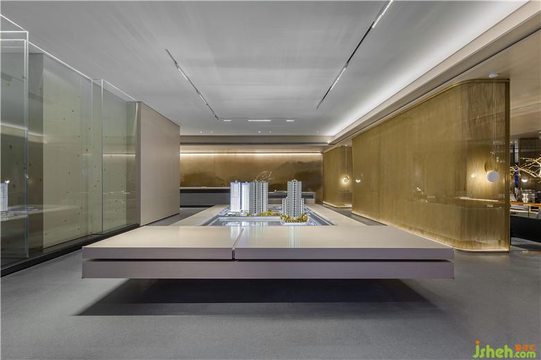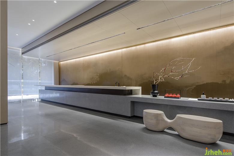 參觀者進入接待處,藉由茶臺產生幾分親近感,加之背景墻山水畫的貫穿,猶如品茗于山水之間,嘗一杯詩意,于空間中自得閑適。