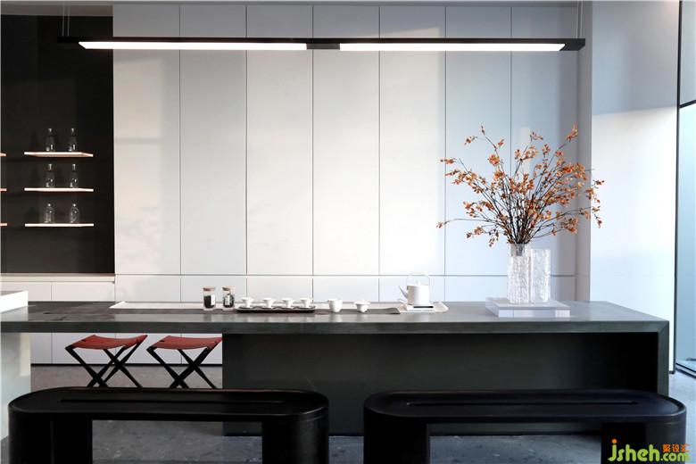 深藍(lán)單人座椅與長(zhǎng)形灰白沙發(fā),柔和了空間的質(zhì)感,讓軟裝充滿素雅的基調(diào)。無(wú)論是洽談圓桌,或是黑色茶幾,皆賦予空間秩序般的美感。