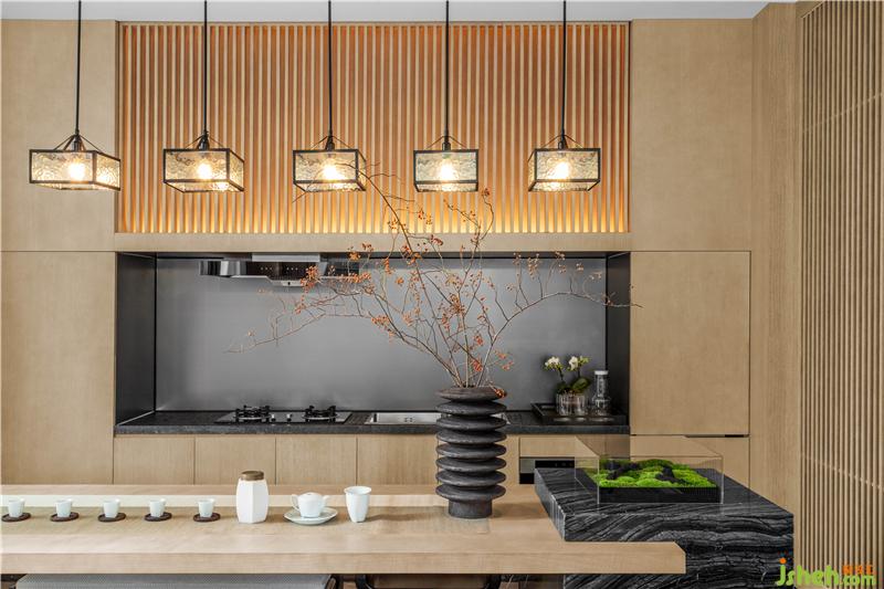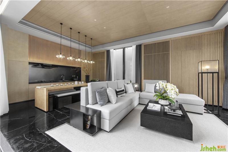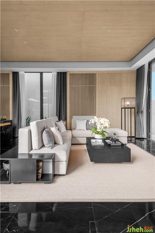木質(zhì)的格柵給予客廳空間溫暖的包圍,質(zhì)樸的氣息由此流露而出。序列般的空間布局,半圍合沙發(fā)結(jié)合大理石地面,帶來(lái)舒適感與親近感,簡(jiǎn)約的元素,賦予室內(nèi)以靜雅。