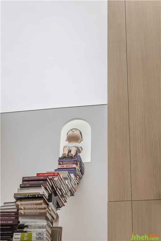 通過(guò)言幾又品牌的植入,加入悠閑的情景體驗(yàn),滿足生活的多種可能性。銷售中心設(shè)計(jì)趣味書本裝置,線條利落的原木書架與空間內(nèi)純粹的大理石肌理相結(jié)合,營(yíng)造出極具儀式感的前廳空間。
