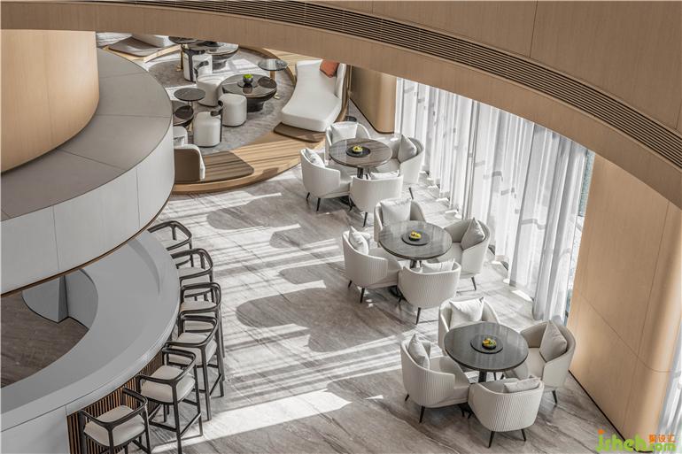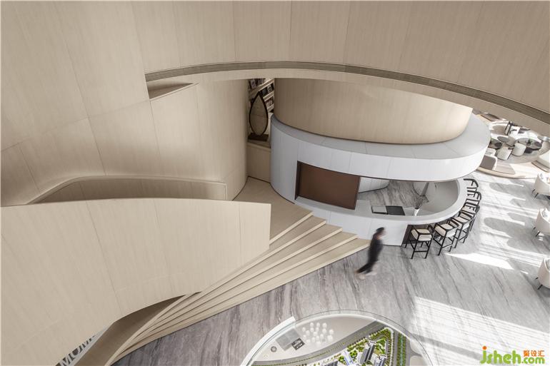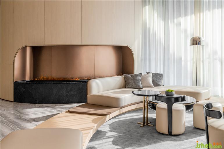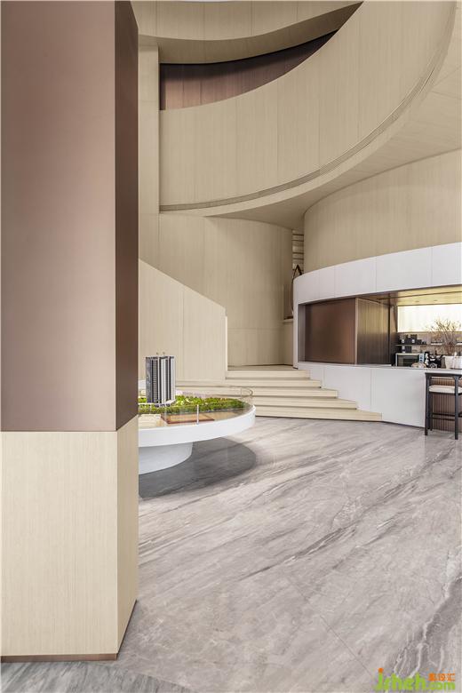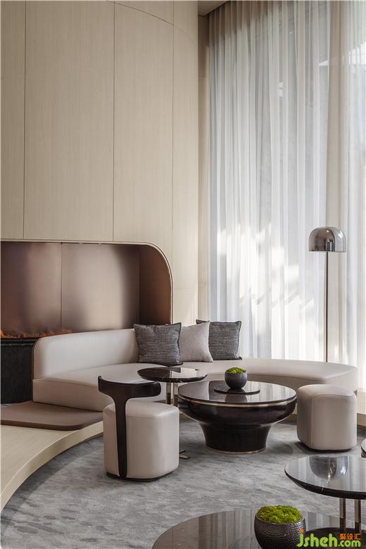 東莞卓越悅山湖花園銷售中心設(shè)計(jì)為了呈現(xiàn)空間的流動(dòng)藝術(shù)感,洽談區(qū)在圓弧的建筑漫步背景下,給予溫暖的包裹。懸浮感的沙發(fā),與落地窗外的水景,地毯呼應(yīng),似流水沖刷到腳背,宛如身處漂浮的游艇之中。