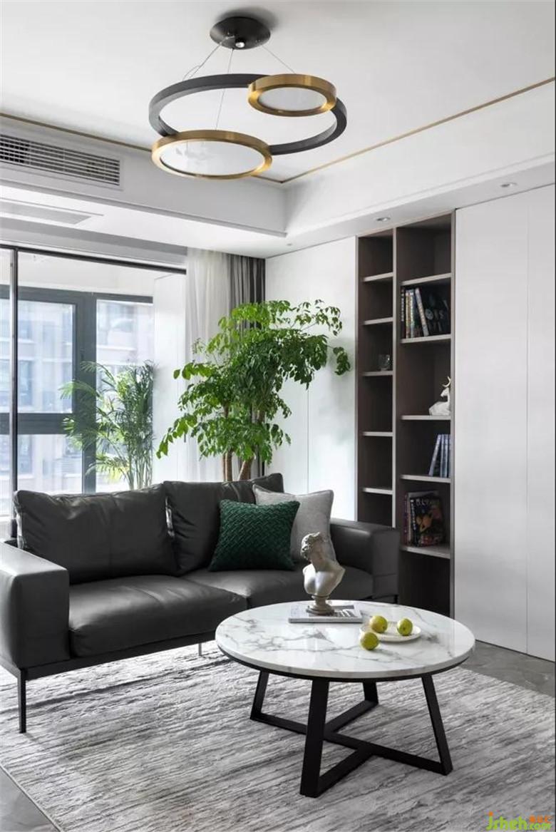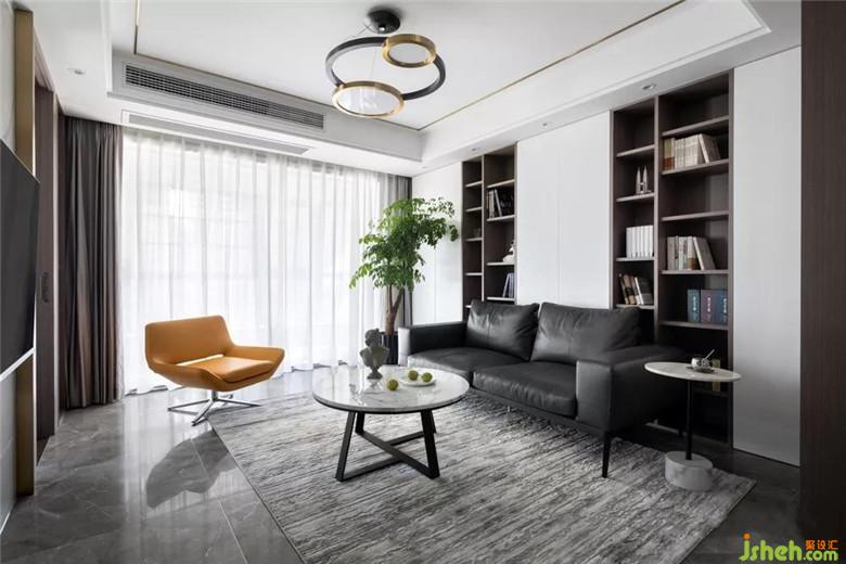 本案客廳對坐式的格局滿足了屋主對于互動交流以及閱讀收納的需求,同時考慮到收納及清理的便捷性,客廳正面柜體采用了柜體封閉與展示交錯的設(shè)計,豎向的線條拉伸了空間,使之顯得高挑