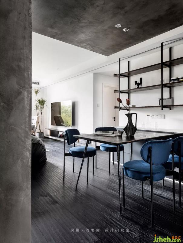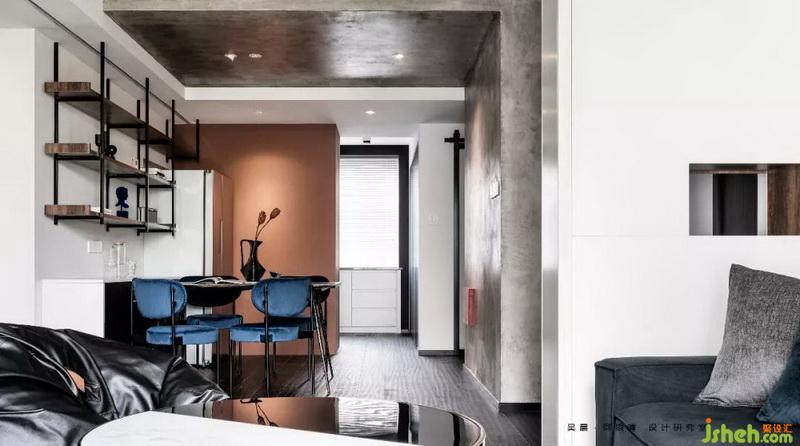 老房子層高的有限性、結(jié)構(gòu)梁的界限,不如就讓空間像游戲般,從機(jī)能和感官上都有不同的趣味變化,墻頂看似包裹卻又無限延伸。木制、黑白材質(zhì)滿足收納機(jī)能,藏藍(lán)、明紅等猶如舞臺(tái)劇產(chǎn)生戲劇沖突感。