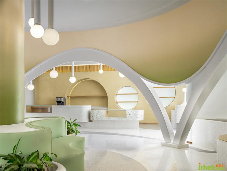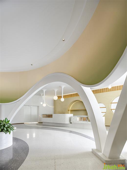 接待臺與咖啡吧功能結(jié)合。廈門幼兒園設(shè)計以圓拱造型圍合空間,為空間的動線布局帶來更大的自由度,保持了大廳空間整體性和通透性,這也為孩子們創(chuàng)造出更多玩耍的可能性。