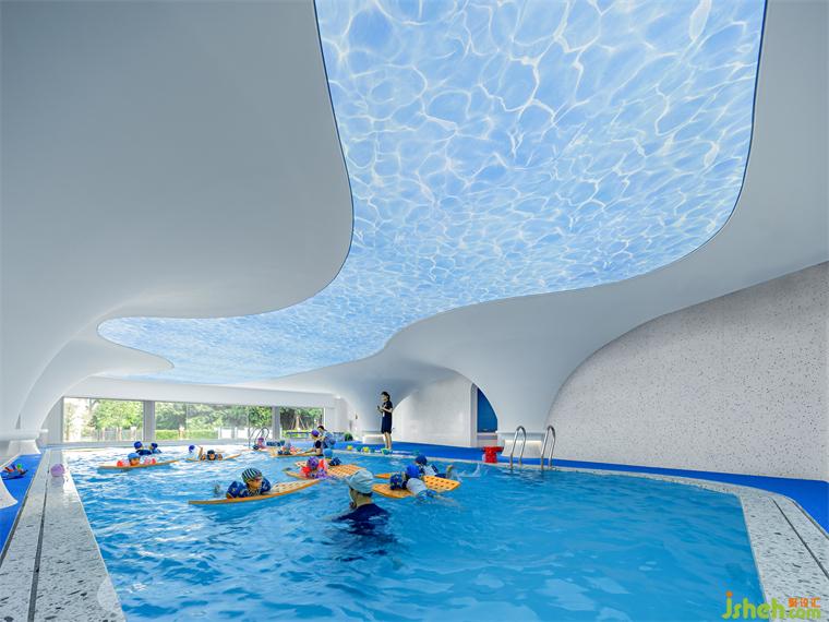 廈門幼兒園設(shè)計用一種極簡而整體的形式表達(dá)出空間連貫與統(tǒng)一性,這種純粹的表達(dá)更象是水要傳遞給我們的啟迪,天花倒映的水體,形成一種空間懸浮效果,如同沉浸在水體之中。