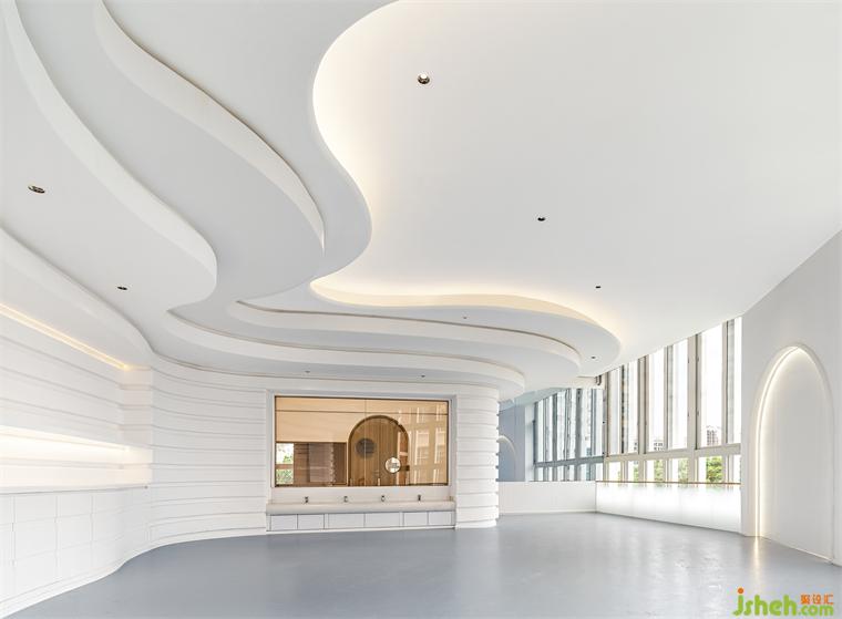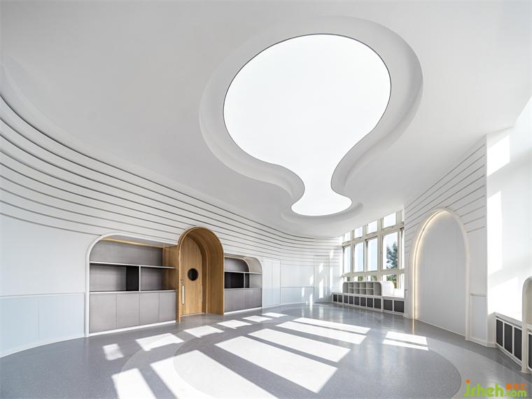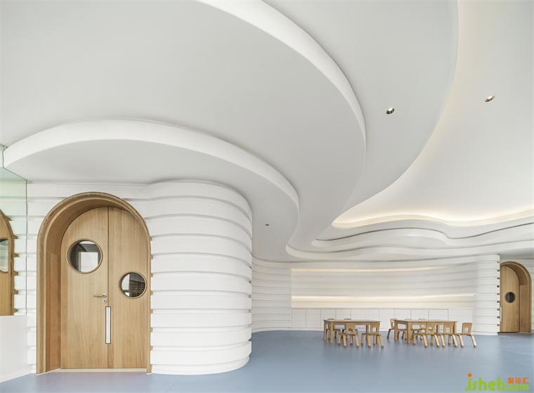 廈門幼兒園設計以云的層疊軌跡為核心貫穿空間,用豐富的疊級造型塑造空間,墻面和頂面更加完整化一體化,讓空間實現(xiàn)統(tǒng)一和純粹。