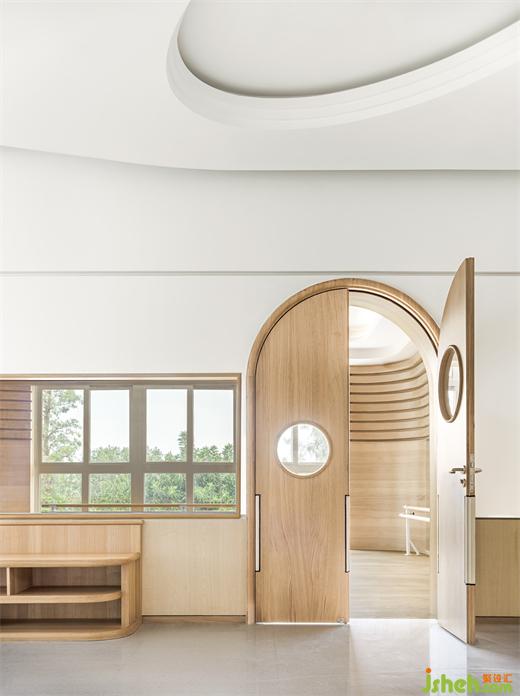 原木色的材質(zhì)和有機的造型,營造了一種溫潤、自然的空間感受。讓人聯(lián)想到大自然的懷抱,仿佛置身于茂密森林或溫暖的陽光下。彎曲的線條、圓潤的邊角,如同自然界中的形態(tài),充滿生命力和活力。