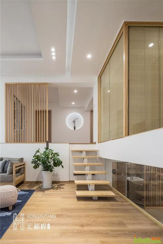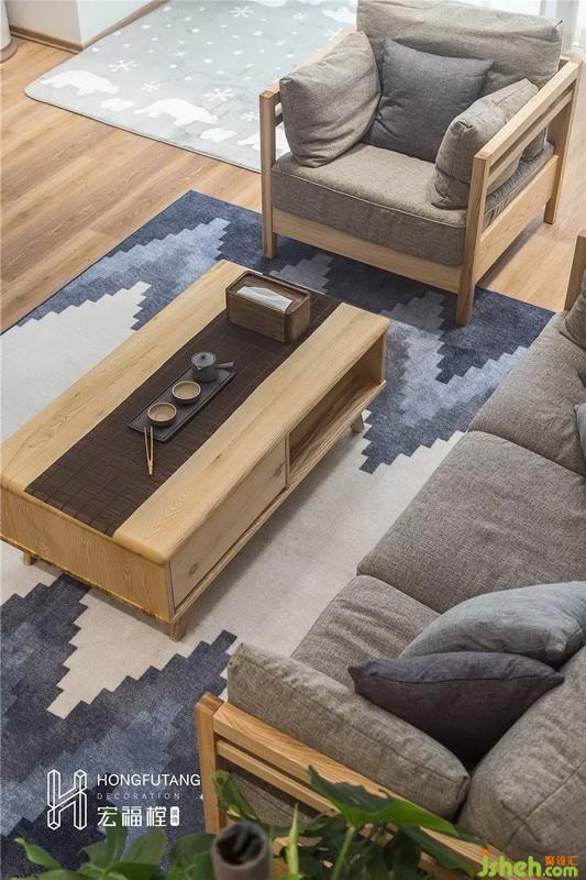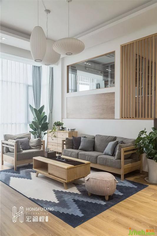 客廳用冷色調搭配原木色家具,沙發(fā)色彩是簡單的麻質灰,低純度的色系干凈利落。選擇漸變藍地毯彌補小面積茶幾帶來的視覺空白;摒棄傳統(tǒng)電視,采用投影,視覺上擴大感官,減少電視對空間的占用;客廳上方選用拇指柵欄隔離二樓公共區(qū)域,一是可以保障安全,避免從樓上摔下,二是木質柵欄相比其他隔斷更通透;木質樓梯清新簡潔,整個客廳沒有過多的裝飾,秉承了日式的簡約實用性。