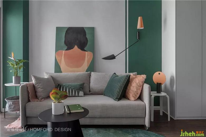 整個(gè)空間以白色、灰色、墨綠(她喜愛的顏色)為主,藕粉、低飽和橙色作為點(diǎn)綴,采用無主燈設(shè)計(jì),幾何石膏造型吊頂。
