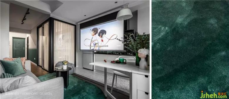 客廳搖身一變,變成了最舒適的區(qū)域??紤]到父母偶爾會(huì)探望,所以選用了實(shí)用性較強(qiáng)的沙發(fā)床。軟軟的布藝+懶人沙發(fā),用手觸及就能感受到溫度的地毯,80寸的投影屏幕,不管是和閨蜜宅在家里還是一個(gè)人獨(dú)處或是與他共度的周末時(shí)光,都一定會(huì)是最享受的時(shí)刻。