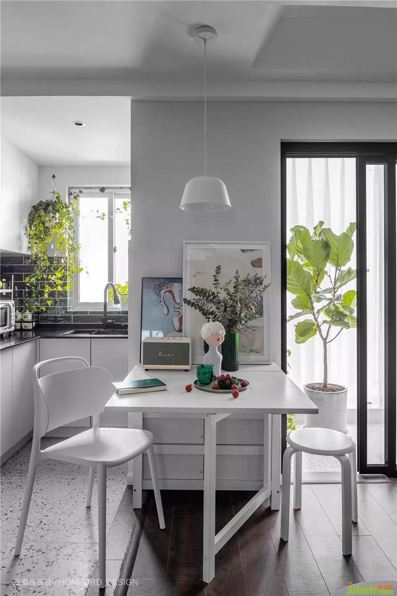 因女主做飯時(shí)間少,封閉廚房改成了開放式,光照可從廚房直接穿透到餐桌附近,加大了空間的明亮感。配上幾顆綠植,像極了一幅日光下的綠色盛宴。