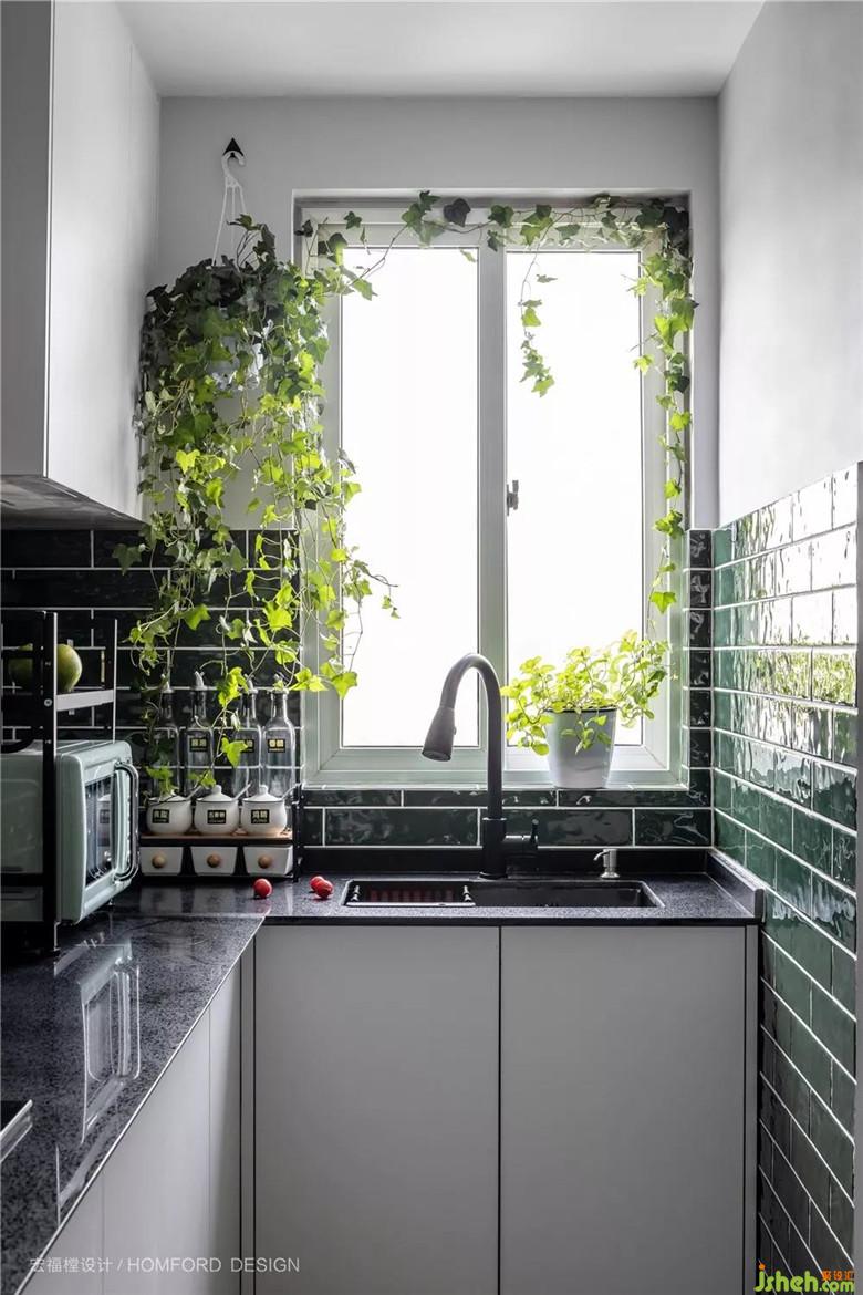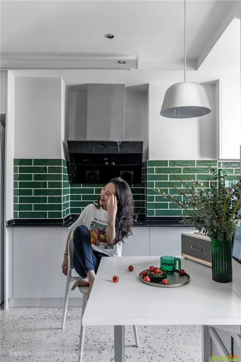 容易接觸到油漬的地方采用墨綠色磁磚鋪貼,非常利于有一點(diǎn)懶懶性格的她偶爾的簡單打掃。