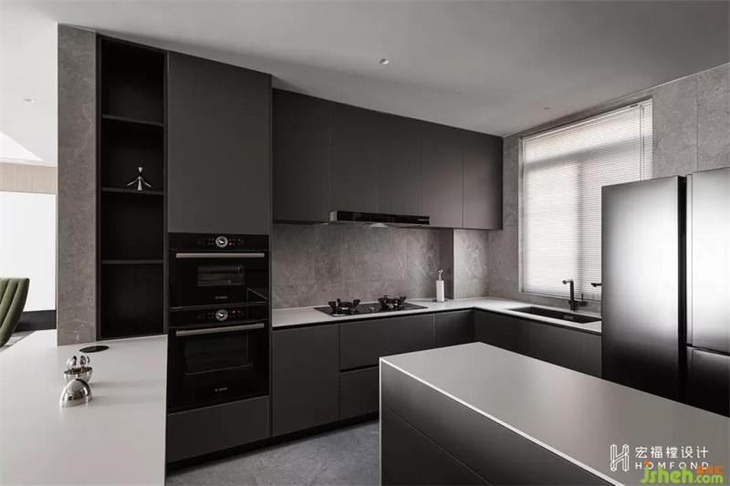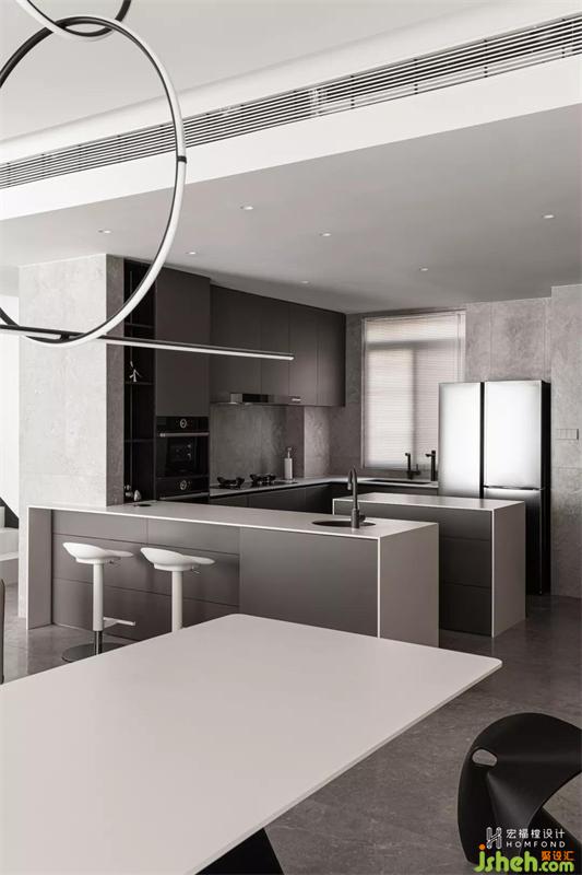空間中互相呼應(yīng)的材質(zhì)讓不同體塊的廚房柜體變得不再呆板,并帶來(lái)準(zhǔn)確的秩序。當(dāng)它們貫穿于使用之中時(shí),便會(huì)充分展現(xiàn)出設(shè)計(jì)師給予它們的生活形態(tài)。這樣多功能的居住空間也為居住者提供一個(gè)適宜的私人聚會(huì)、休閑場(chǎng)所。