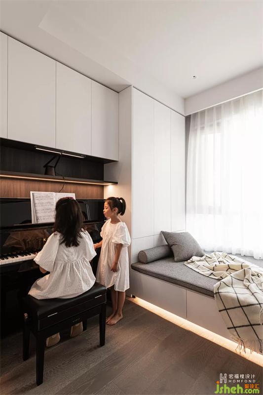 女兒們的琴房位于樓梯一側(cè)較私密的房間,在學(xué)習(xí)之余彈奏鋼琴可以為她們創(chuàng)造更優(yōu)雅的音樂(lè)世界,接受更多西方古典文化的熏陶。一曲悠揚(yáng)的曲子有時(shí)總能安撫青春期帶來(lái)的煩躁與不安,讓心境變得怡然自得。