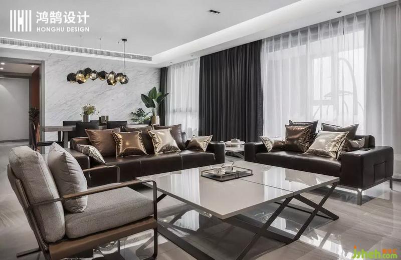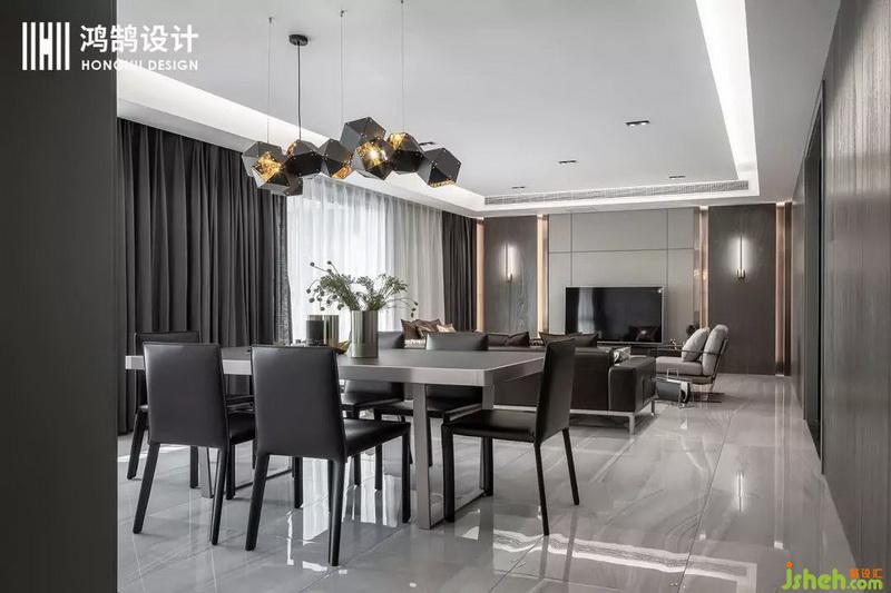 客餐廳為一個通長的空間采用中軸對稱的布局方式,讓空間顯得更加的開闊,用材上采用了木材、金屬、皮質三種材質的穿插,表達現代輕奢的質感跟層次。