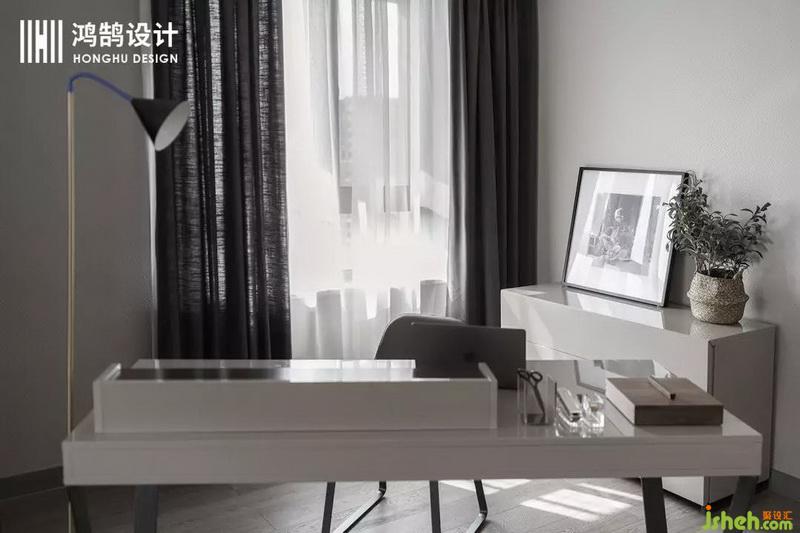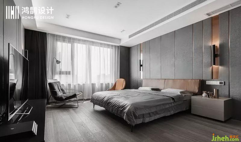 主臥室是一個通長的比較開闊的臥室跟書房空間,在就寢區(qū)設計公司采用三邊圍合的床背景來劃分區(qū)域讓人有安全感,用材上采用了深色硬包增加臥室的神秘感,用金色的金屬點綴提升空間層次和質感。