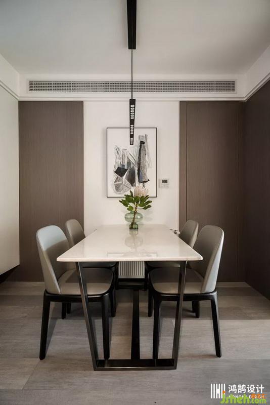 線形黑色吊燈呼應(yīng)整體風(fēng)格,選擇這款燈時(shí),設(shè)計(jì)師對(duì)比了很多,表示好看又合適的燈很難買,但買對(duì)了就能錦上添花。桌上一大朵帝王花開得正艷,點(diǎn)亮了餐廳。