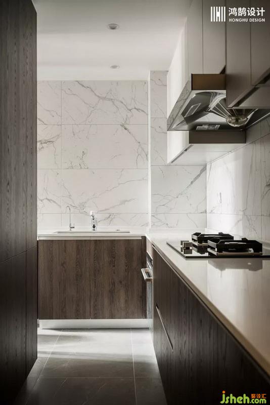墻面全部用大理石瓷磚鋪就,營(yíng)造出簡(jiǎn)潔氛圍,業(yè)主希望把所有物品都收起來,所以臺(tái)面上沒有任何掛桿之類的收納用具。業(yè)主表示,住進(jìn)來之后,如果收納有需求可以再添加 。櫥柜是在特銘定制的,留出了足夠的儲(chǔ)物空間,冰箱旁邊是一個(gè)定制收納柜。雙飾面板柜門品質(zhì)好,打理方便。走進(jìn)去才發(fā)現(xiàn)L型廚房?jī)?nèi)部空間非常大,最里面還隔出了一間洗衣房。
