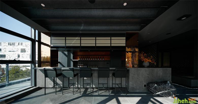 鏡面材質(zhì)的運(yùn)用,滲透在空間中大面積的黑色意識(shí)中,制造出了強(qiáng)烈的視覺張力,自然材質(zhì)的吧臺(tái),粗糙中帶著理性,彌散著手工藝觸手可及的溫度。