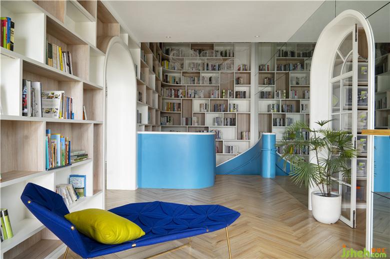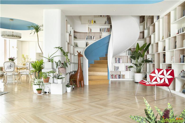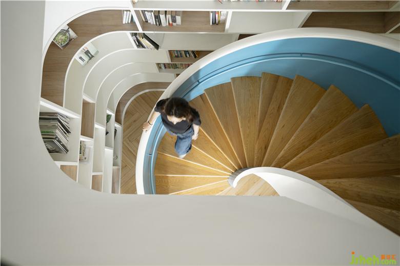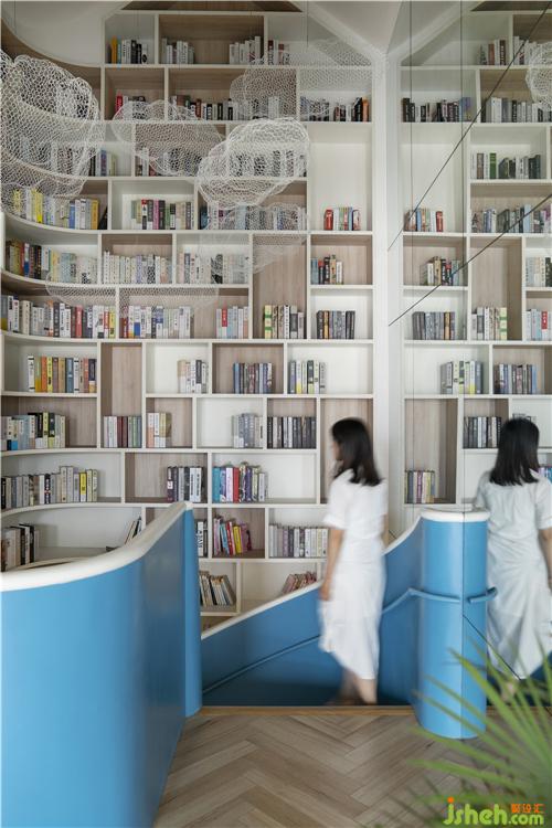 別墅設(shè)計(jì)從一樓整壁延伸到二樓的巨幅書架,圍繞著樓梯布局,木色和白色的木格,大大小小錯(cuò)落而設(shè),與樓梯色彩形成呼應(yīng),自帶跳躍的節(jié)奏感。貫穿二層樓的樓梯。帶有韻律感的弧線盤旋而上,白色的外輪廓卷著海藍(lán)色的底色翻涌而上,四周圍繞著書海,意境就很美。