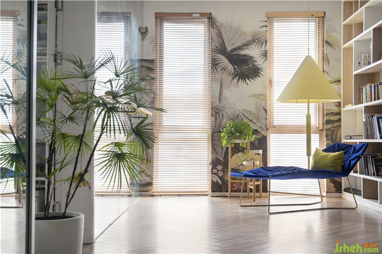 樓梯上來是一片面積不大的休閑區(qū),方便主人找到心儀的書時(shí)可以快速閱讀。藝術(shù)躺椅邊一盞巨大的黃色Maison Dada吊燈垂下,落地書架伴著棕櫚樹壁紙的葉影婆娑……這里依舊是一副海島度假的愜意模樣。