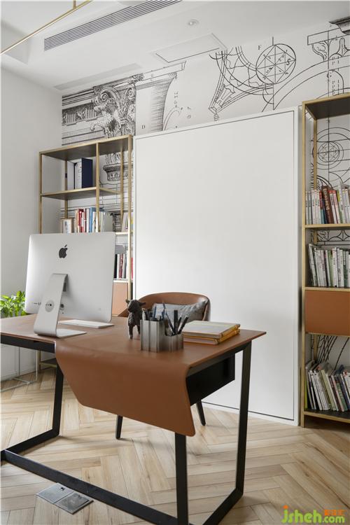 這間獨(dú)立工作室也可兼做客房,書架中間的白色墻體是折疊床,需要的時(shí)候移開書桌,放下床板即可使用。
