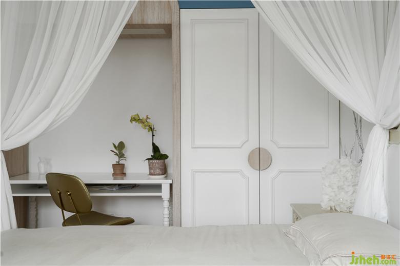 兼具浪漫與實(shí)用的主臥,緊湊地設(shè)置了連體墻柜與梳妝臺(tái)。
