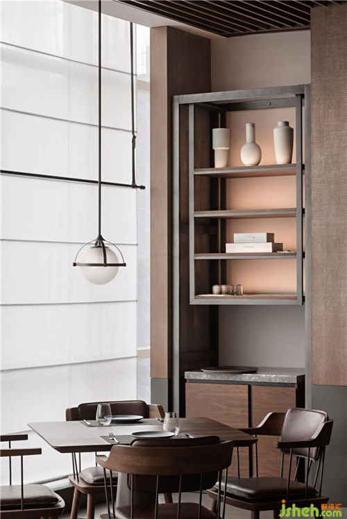 復(fù)古的吊燈與金屬吊頂相結(jié)合,增加了空間的穩(wěn)重感、木質(zhì)桌椅搭配大理石的厚重,為復(fù)古的空間植入了現(xiàn)代的氛圍。優(yōu)雅而精致卻又平易近人,置身空間之中有如歸家之感。