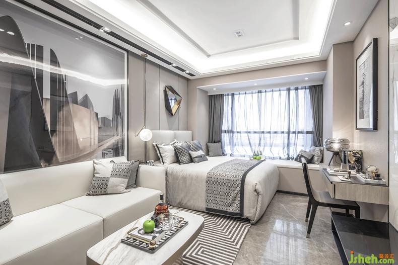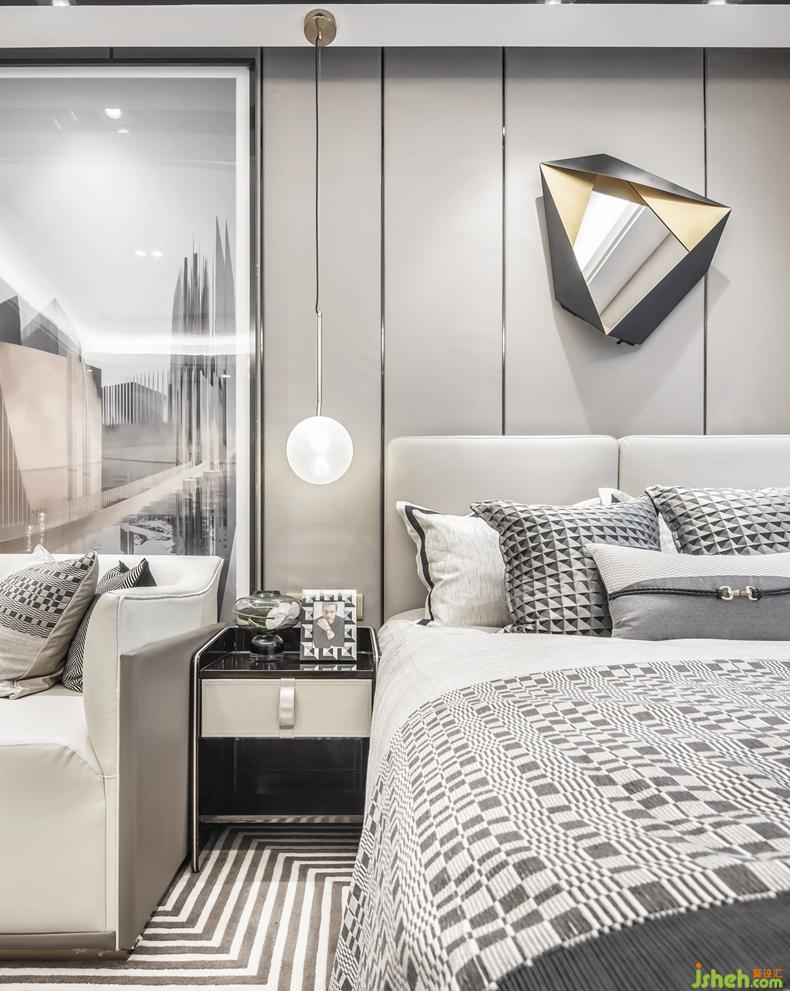 室內(nèi)設(shè)計師創(chuàng)作中最為巧妙的一點是利用衣柜隔斷空間,并根據(jù)元素的不同區(qū)分差異性;客廳所具有的規(guī)整性嚴謹感,都是通過建筑畫、幾何紋理、威士忌酒文化所打造出來的奢華高雅,不同于至簡至奢的入口處,也不同于悠然隨性的臥室。