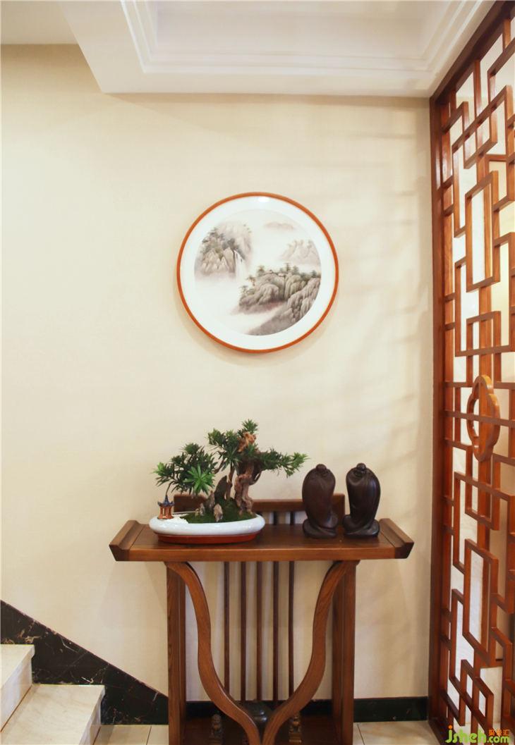 整個(gè)設(shè)計(jì)室內(nèi)布局上面,采用中國(guó)人最喜歡的對(duì)稱式布局,格調(diào)高雅,端莊穩(wěn)重。在材料使用方面,主要采用了木線裝修,修飾出中式的韻味。陳設(shè)包括字畫、瓷器、古玩、屏風(fēng)、博古架、實(shí)木角花等,營(yíng)造出極具內(nèi)涵的文化氛圍,置身其中可以體會(huì)到修身養(yǎng)性的生活境界。