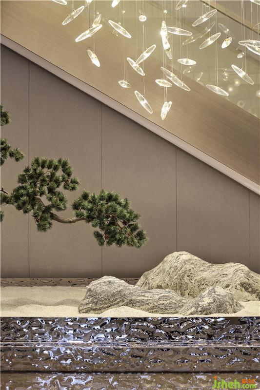 “萬丈洪泉落,迢迢半紫氛。奔流下雜樹,灑落出重云。日照虹霓似,天清風(fēng)雨聞。靈山多秀色,空水共氤氳。”銀泉飛瀑跌宕而下,鏗鏘有力,疾風(fēng)驟雨,亦真似幻。騰空而起的縹緲?biāo)畾?,煙霧繚繞,一派迷蒙與虛無之境?!疤斓仉硽?,萬物化醇”,提取廬山瀑水之韻、之形、之氣、之神,鋪灑在空間各個角落,孕育乾坤交合的生命意境。設(shè)計公司