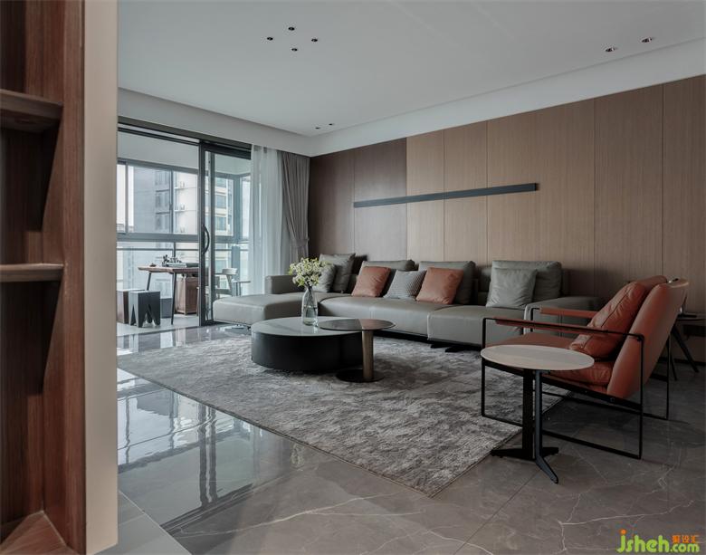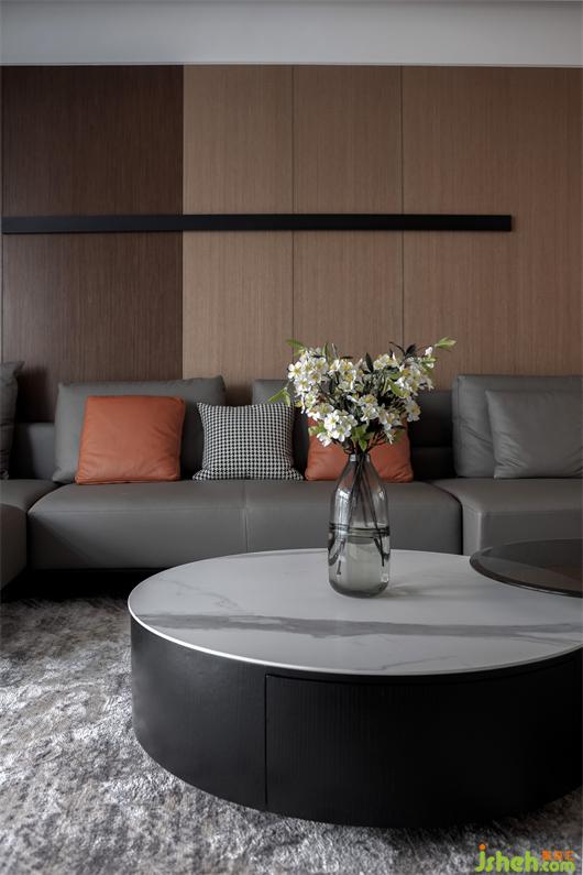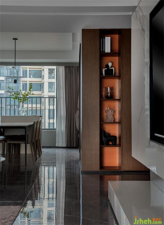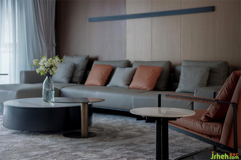 客餐廳設(shè)計拋棄了傳統(tǒng)設(shè)計中亮麗通俗的流行色,豪宅設(shè)計選用了低飽和度的“高級灰”和大面積“暖灰”,以及局部愛馬仕橙作為畫龍點睛之筆。