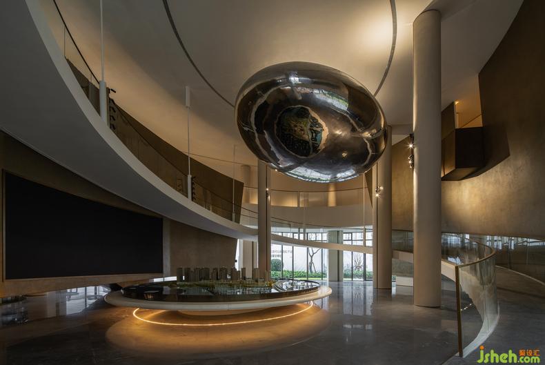 浮起、落下,而又回升,沙盤區(qū)以雙向壁面的向內(nèi)圍構(gòu)形成了感知上的絕對尺度,巨大而透亮的不銹鋼球體,體驗中心設(shè)計以材質(zhì)與造型本身的夸張科技感成為空間視覺的焦點,自上穿越兩層空間的高度垂吊懸空,與中心沙盤互為映照室內(nèi)設(shè)計師