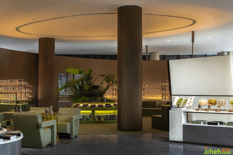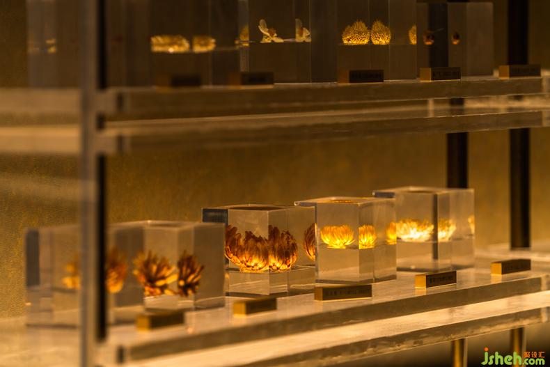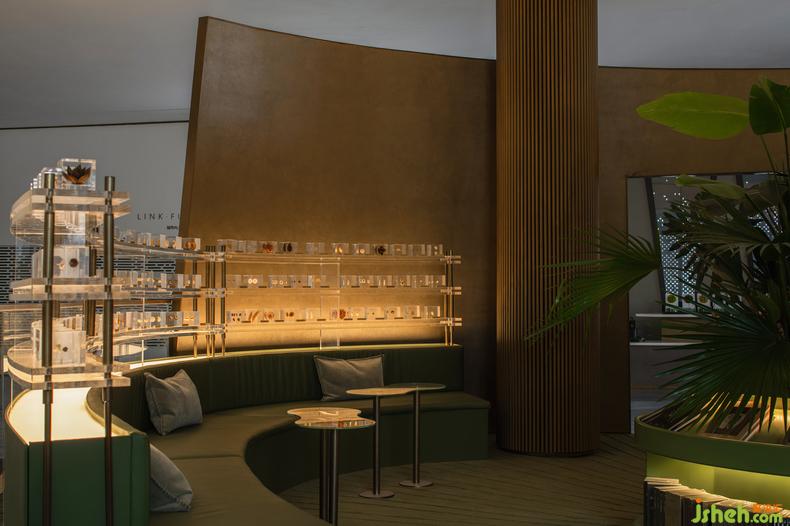 矮櫻的柔嫩、香薊的堅毅、銀杏的治愈......亞克力壓印的葉片標(biāo)本,在局部燈光的映照中,將人們游覽的視線聚焦。復(fù)古的墨綠色調(diào)與黃銅材質(zhì),連通整體空間的設(shè)計語言,在此刻,獨享時光的靜妙。