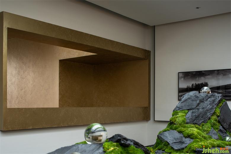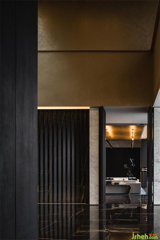 經(jīng)典黑白與金配色,在極簡的幾何線條感的空間節(jié)奏中,呈現(xiàn)出交替、變換的強(qiáng)大藝術(shù)表現(xiàn)力,藝術(shù)審美的純粹感與當(dāng)代人居生活的豐富性,營銷中心設(shè)計在構(gòu)造的細(xì)部質(zhì)地的作用下,形成空間的戲劇張力。
