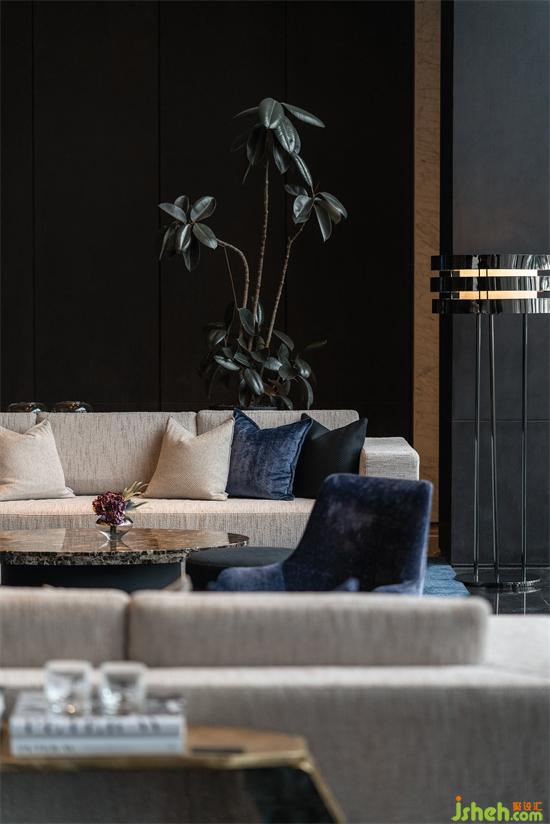 暗調(diào)之下,洽談舒適、淡雅的情調(diào),上升為顯露于外的清淺表達(dá),綿密厚實的布藝與絨,營銷中心設(shè)計以色彩的淡雅與觸感的細(xì)膩溫潤,跳脫于四周圍合的深沉感,承載人們談話的私密與松弛氛圍。
