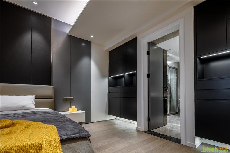 灰藍(lán)調(diào)的主臥,延續(xù)空間基調(diào),簡潔優(yōu)雅。大面積窗戶,讓空間視野更加開闊。室內(nèi)設(shè)計(jì)師