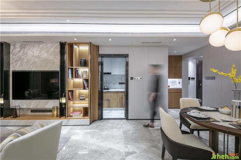 玄關(guān)用深色與鋁合金的搭配凸顯了質(zhì)感,半遮掩的玄關(guān)有著一股中國風(fēng)的韻味。