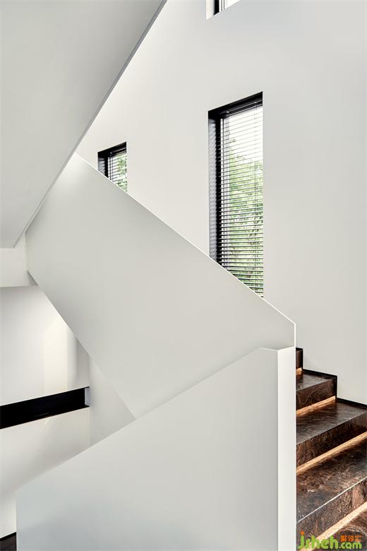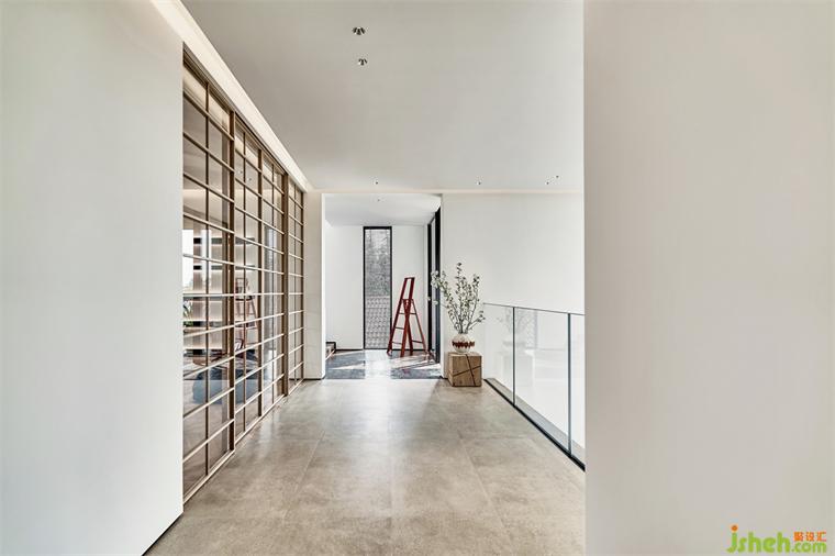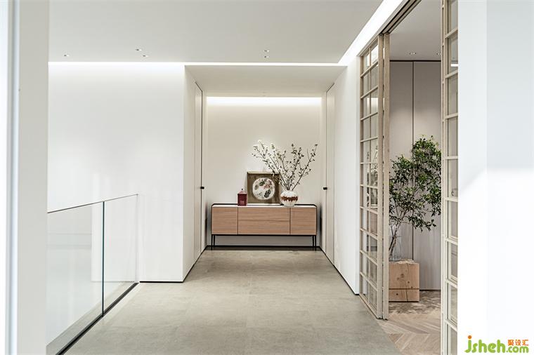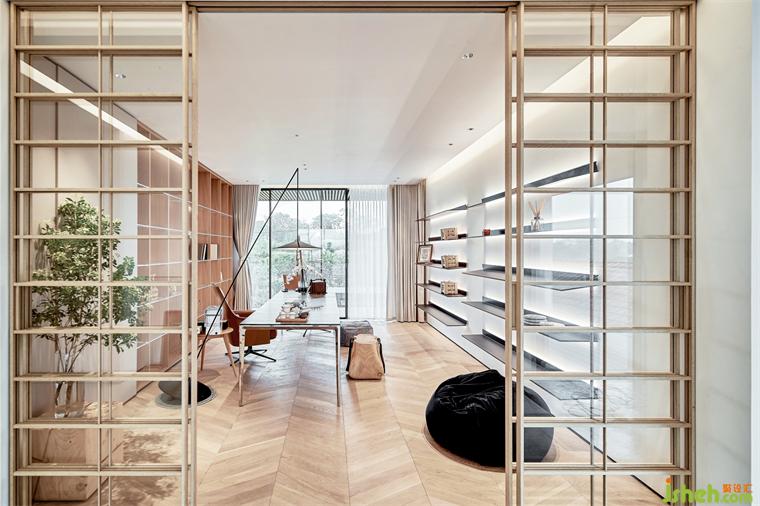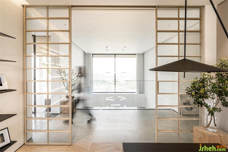 步入二層長廊,舒適溫潤的氣質(zhì)延續(xù)演繹。連接書房和樓道的木格柵,以鏤空設(shè)計控制光線的明暗,輕盈清透的玻璃,引借自然光映亮居室。