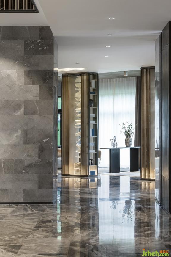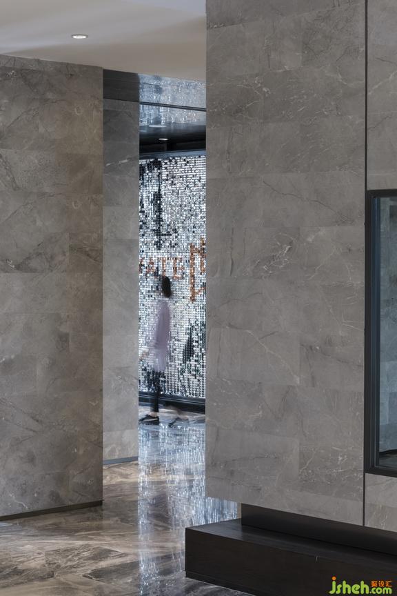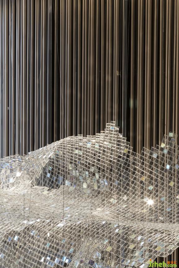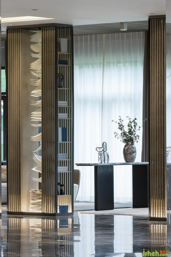 沿建筑內(nèi)部的外圍設置大面積落地窗,將室外的自然景觀與室內(nèi)空間相融合,形成內(nèi)外共通的局面,從視覺角度放大空間。落地窗周圍采用隔柵打造天花,通過材質(zhì)的不同劃定功能分區(qū)。黑色旋轉(zhuǎn)樓梯采用拼裝概念,提升空間的現(xiàn)代感,同時置入小型水滴形裝置吊飾,形態(tài)、材質(zhì)及大小的對比使空間達到視覺美感的平衡狀態(tài)。休憩區(qū)將裝置藝術、書架和隔斷三種功能結合,達到實用性與藝術性的共融。仿照書頁的藝術裝置以材質(zhì)的輕盈感模擬漂浮意境,提升空間的靈動性與透氣性。室內(nèi)設計師